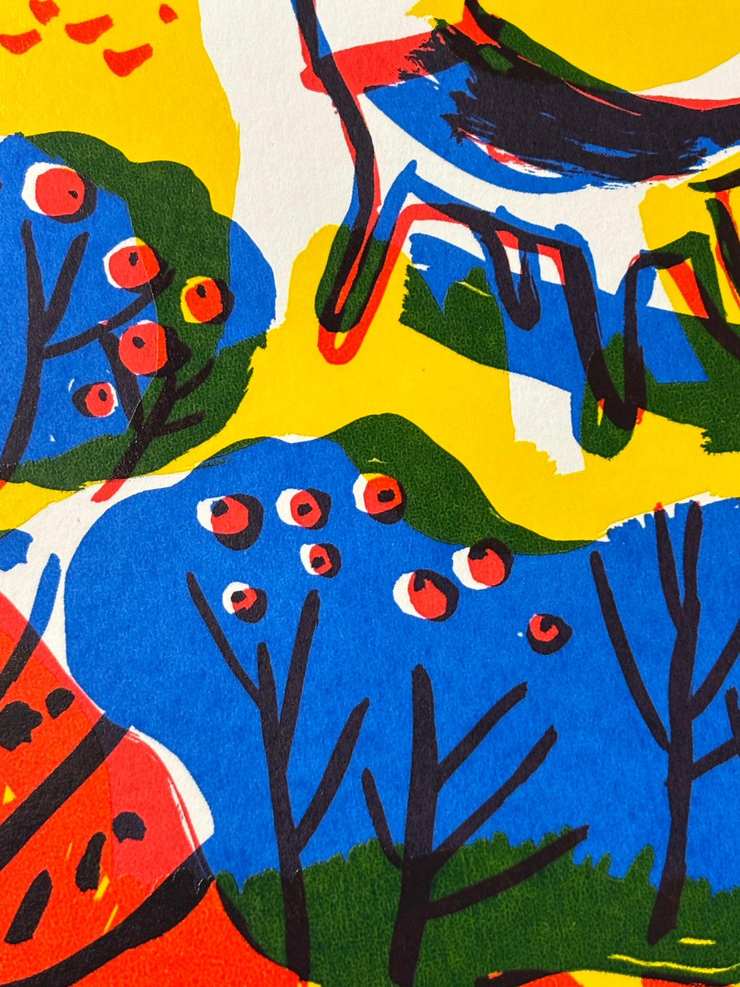 A3 screen print in three colours, printed on Snowdon 300gsm paper.
